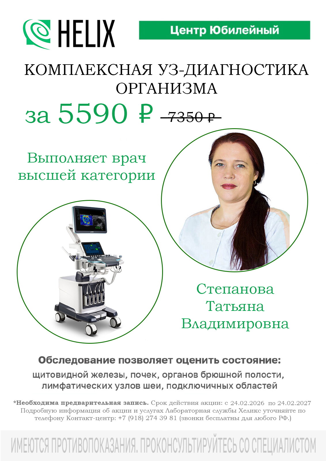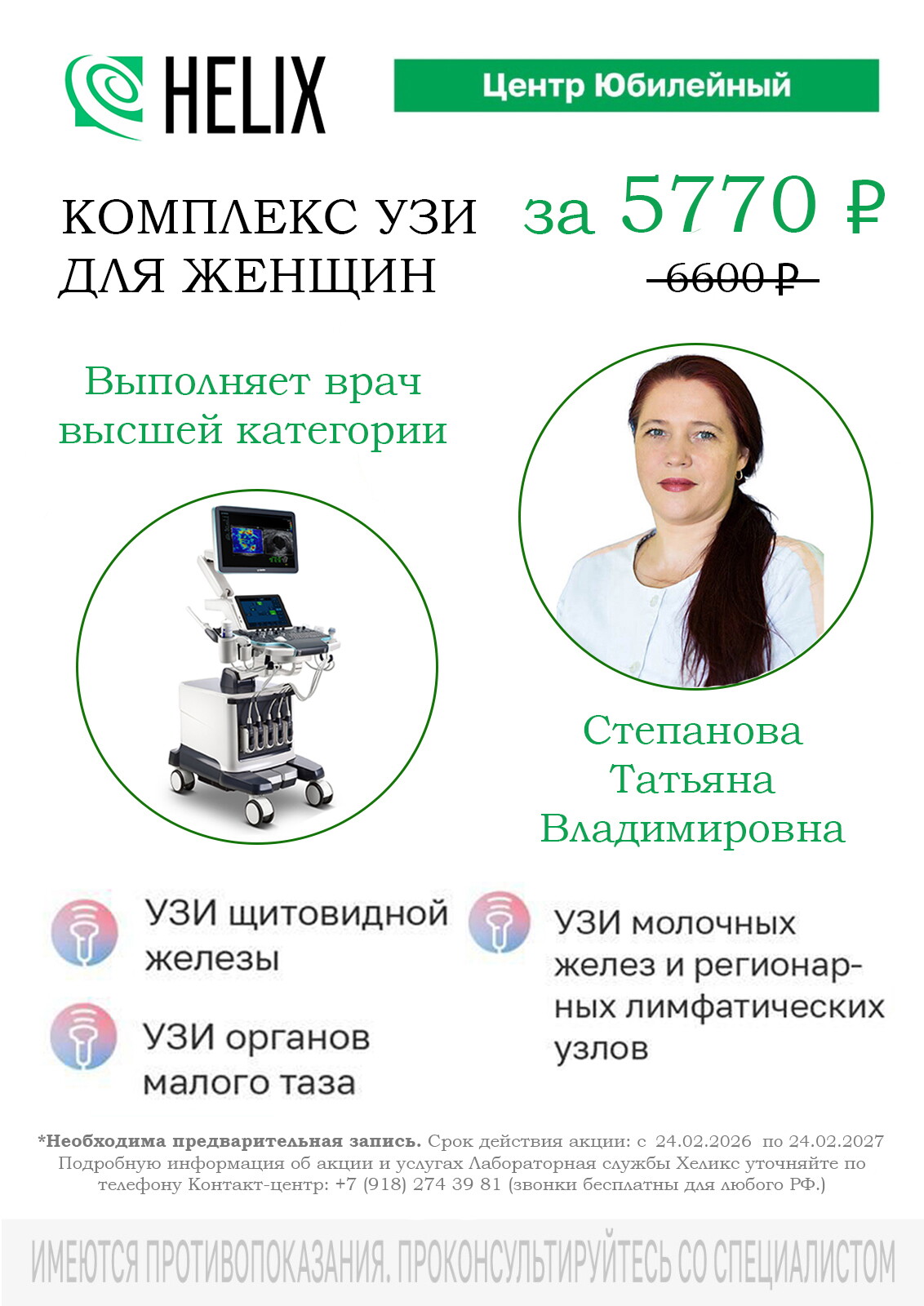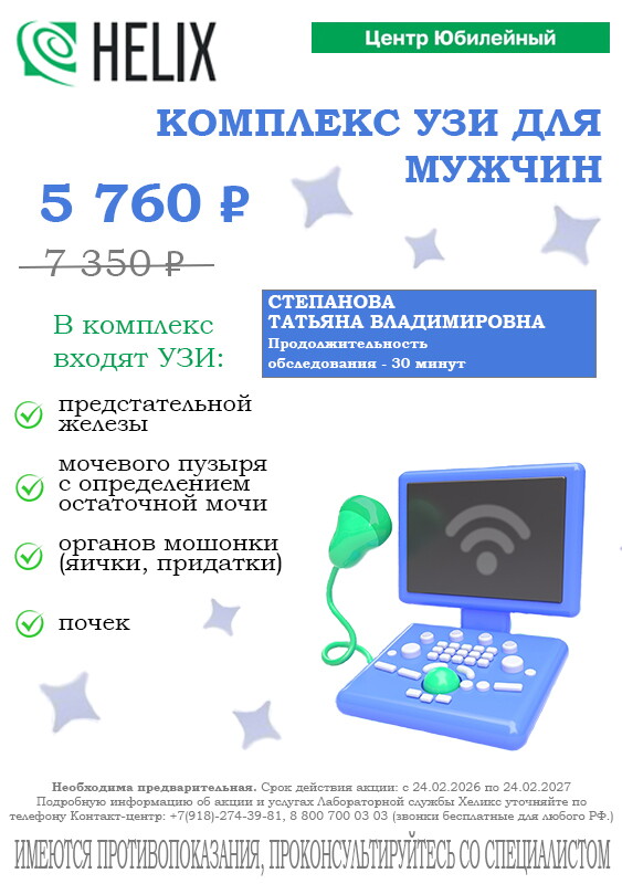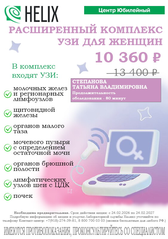 В Хеликс на Юбилейном работает прекрасный врач. Выражаю огромную благодарность врачу Степановой Татьяне Владимировне. Врач УЗИ с большой буквы!!! Благодаря ей моя операция прошла запланировано. Если бы послушала других врачей УЗИ, то экстренно пришлось бы оперироваться.